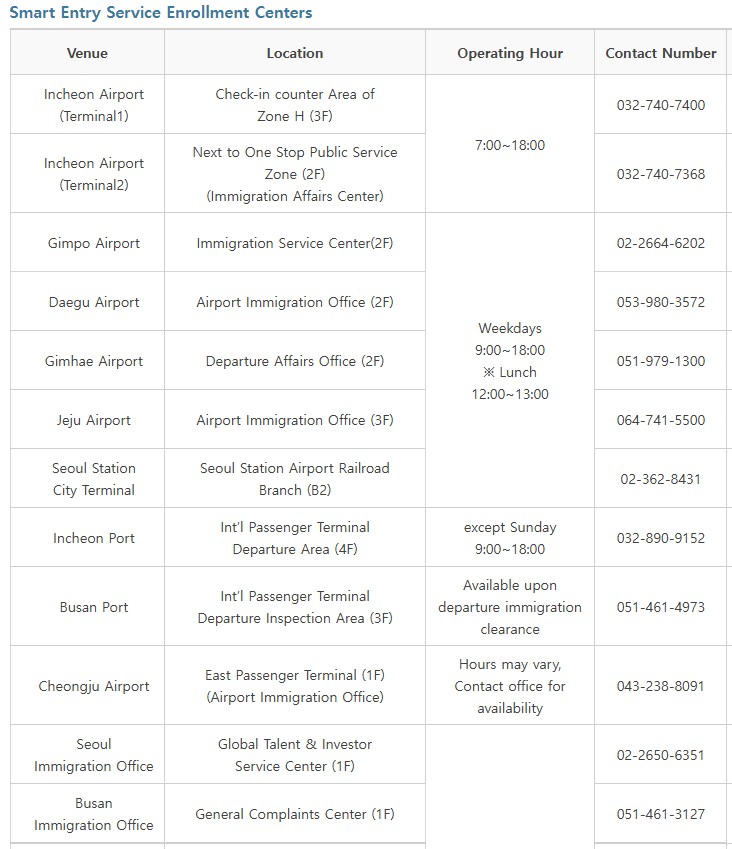 請依現場公告或韓國官方Smart Entry Service(SES)、英文版為主 、台灣內政部移民署、HIKOREA網站查詢申辦地點
